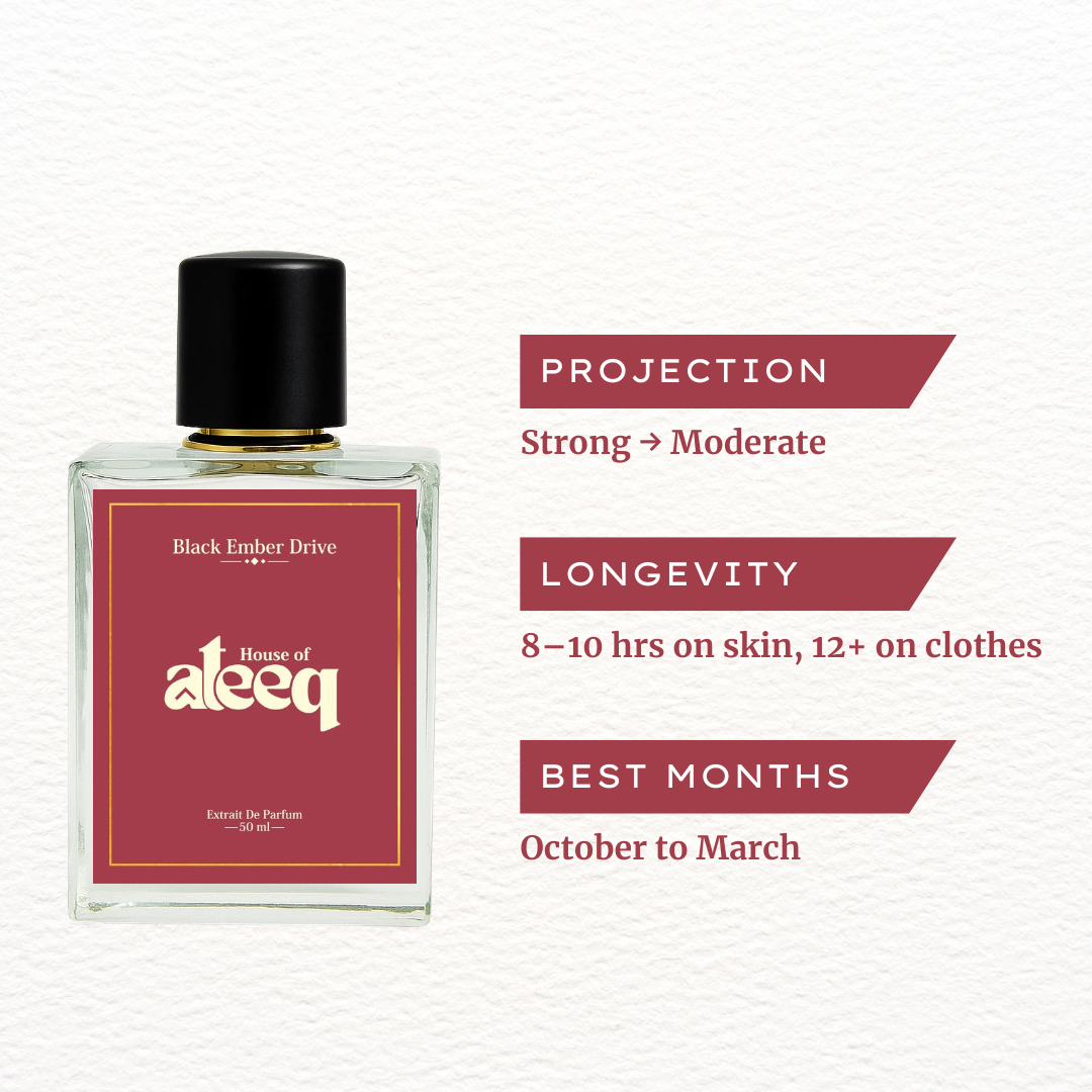 Black Ember Drive by House of Ateeq captures the allure of danger and the thrill of power. It is the essence of a man who moves through the night with confidence — magnetic, mysterious, and unapologetically bold. The fragrance opens with a flash of fiery cardamom, transitions into a creamy heart of addictive toffee, and settles into the deep sensuality of amberwood and bourbon vanilla.
