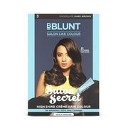BBlunt Salon Secret High Shine Crème Hair Colour in Chocolate Dark Brown offers a salon-quality hair coloring experience at home. This 3-part kit includes a colorant, developer, and a unique shine tonic enriched with silk proteins. The formula provides 100% grey coverage, imparts a rich chocolate hue, and leaves hair with a glossy finish. Specially designed for Indian hair textures, it ensures vibrant, long-lasting color without the use of ammonia.